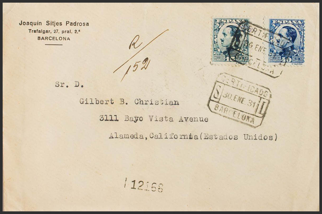 493, 497. 1931. 15 cts dark green and 40 cts blue. Certificate from BARCELONA to ALAMEDA (USA). On the back arrival. MAGNIFICENT.