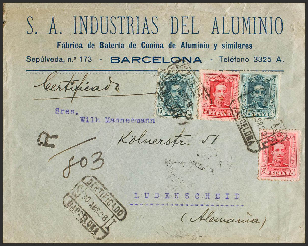 315(2), 317(2). 1928. 15 cts, two stamps and 25 cts, two stamps. Certificate from BARCELONA to LUDENSCHEID (GERMANY). On the back arrival. MAGNIFICENT.