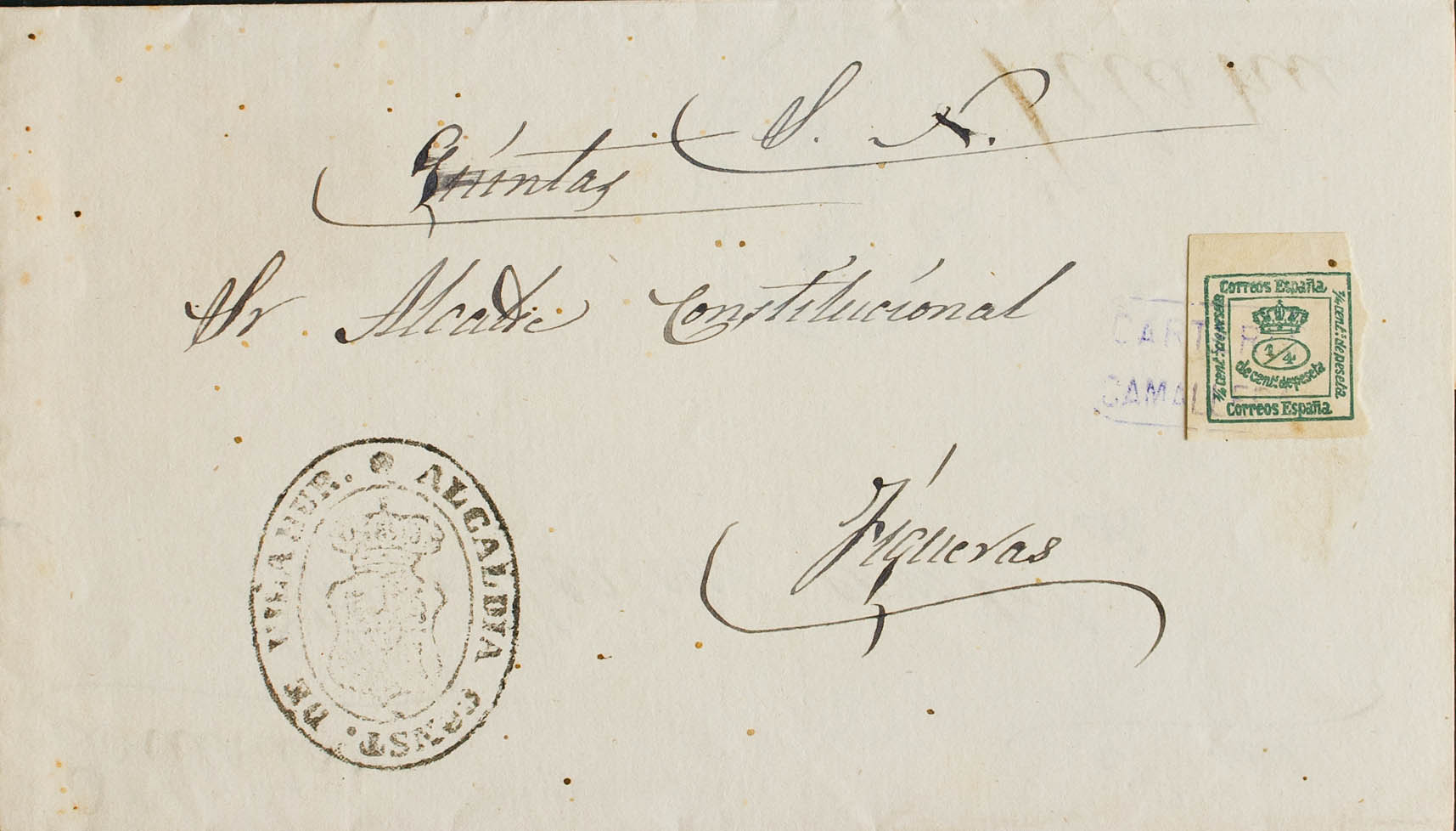 173. (1881ca). ¼ tsp green CAMALLERA to FIGUERAS (reused in reverse). Postmark CARTERIA / CAMALLERA, in violet and on the front mark ALCALDIA CONST. DE VILAHUR, manuscript "Quintas" (referring to the Quintas Militares). MAGNIFICENT AND RARE.