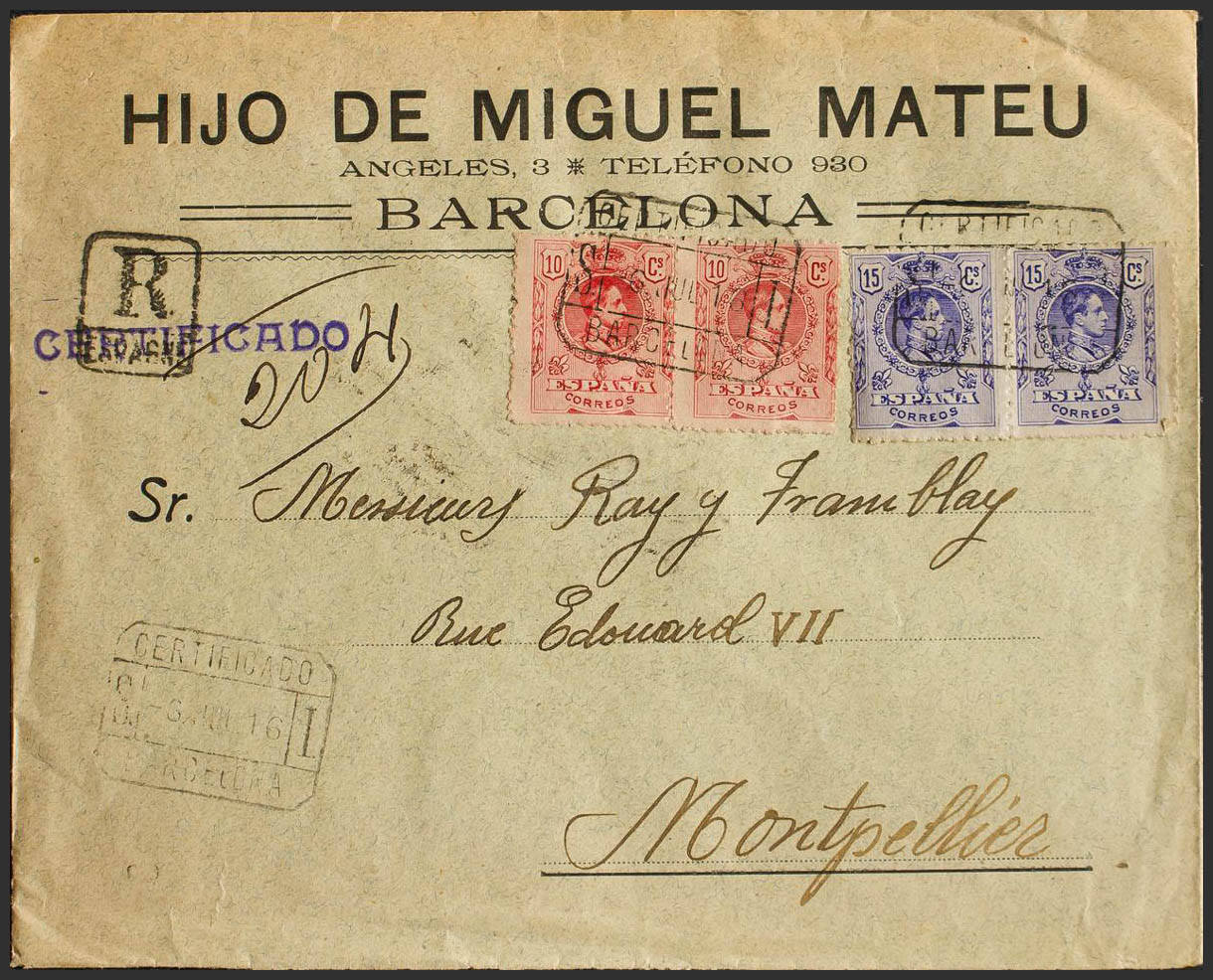 269(2), 270(2). 1916. 10 cts carmine, pair and 15 cts violet, pair. Certificate from BARCELONA to MONTPELLIER (FRANCE). On the back arrival. MAGNIFICENT.