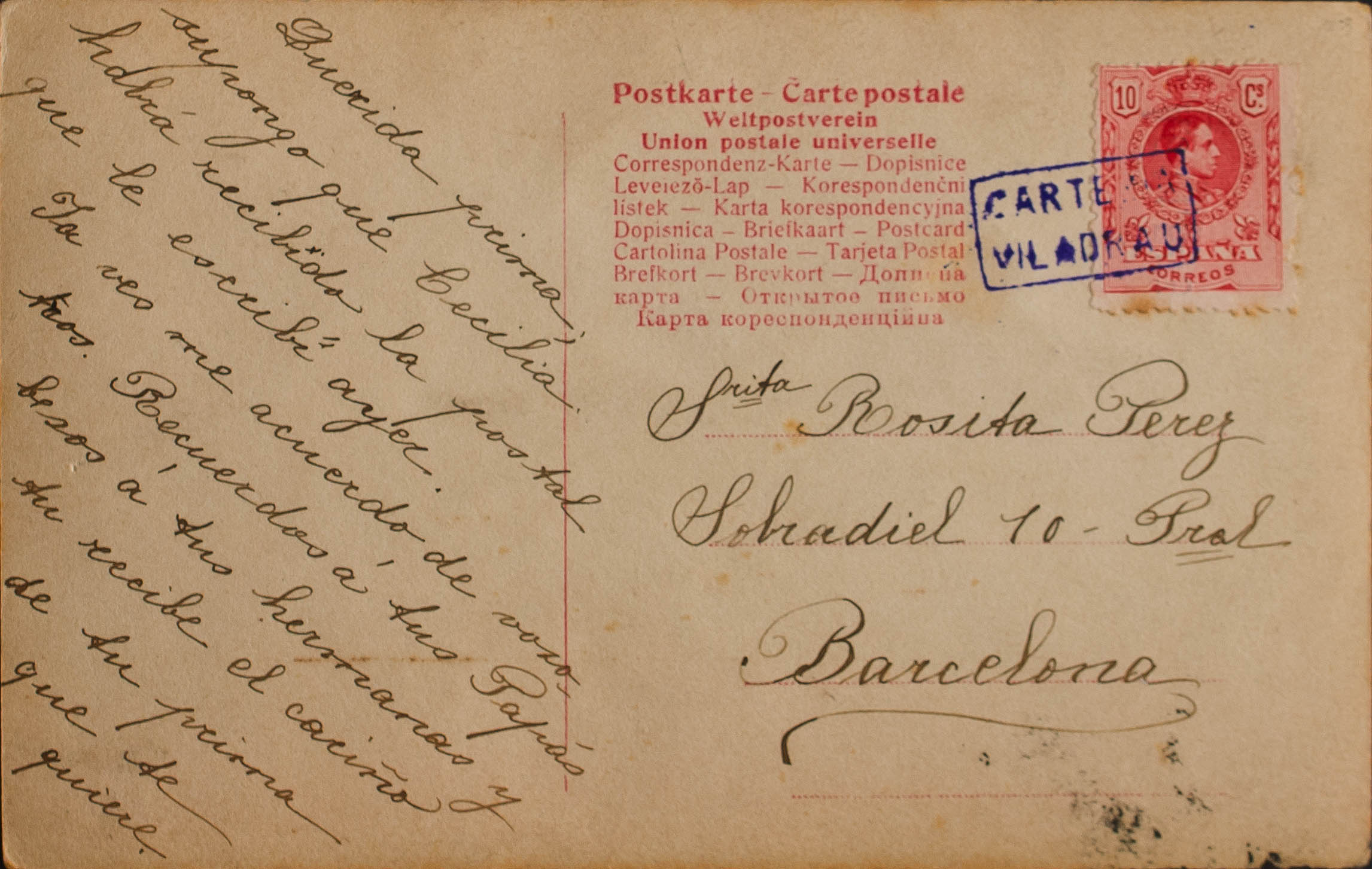 English 269. 1909. 10pts red. Postcard from LA SALA (VILADRAU, GERONA) to BARCELONA. Special postmark CARTERIA / VILADRAU, in violet. MAGNIFICENT.