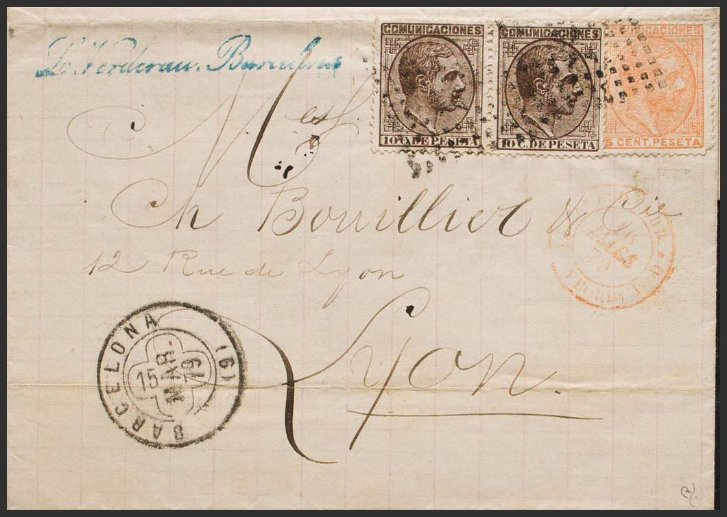English 191, 192(2). 1879. 5 cts orange and 10 cts chestnut, two stamps. BARCELONA to LYON (FRANCE). MAGNIFICENT AND VERY RARE COMBINATION OF POSTAGE TO COMPLETE THE RATE OF 25 CTS TO FRANCE. Ex-Blight.