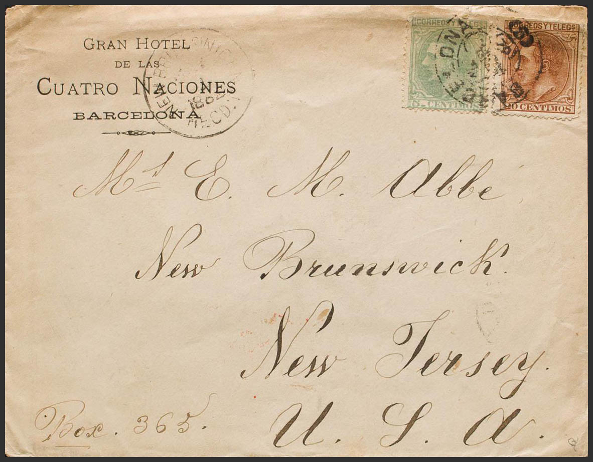201, 203. 1882. 5 cts green and 20 cts red chestnut. BARCELONA to NEW JERSEY (USA). MAGNIFICENT AND VERY RARE POSTAGE. Ex-Blight.