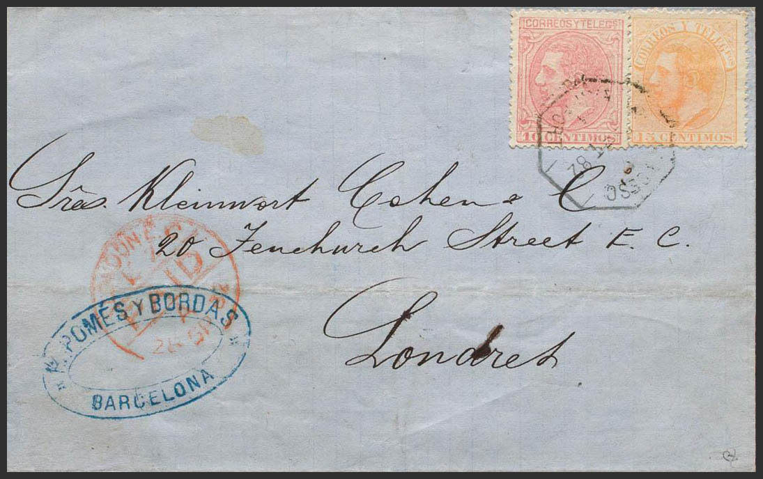 210, 202. 1882. 15 cts yellow orange and 10 cts pink. BARCELONA to LONDON (ENGLAND). Walking postmark. MAGNIFICENT AND RARE. Ex-Blight.