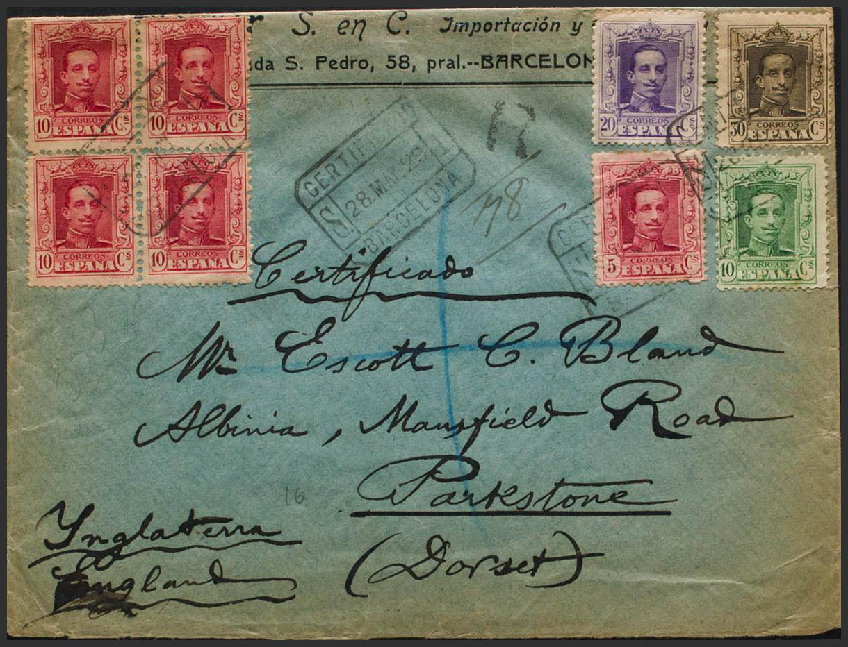 English 312, 313(4), 314, 316, 318. 1929. 5 cts carmine, 10 cts carmine, four stamps, 10 cts green, 20 cts lilac and 30 cts chestnut. Certificate from BARCELONA to PARKSTONE (ENGLAND). On the back vignette International Exhibition Barcelona 1929 and arrival. MAGNIFICENT. Ex-Blight.