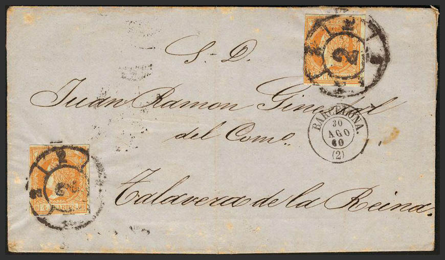 English 52(2). 1860. 4 yellow cuartos , two stamps. BARCELONA to TALAVERA. Postmark R. CARRETA Nº 2. MAGNIFICENT.