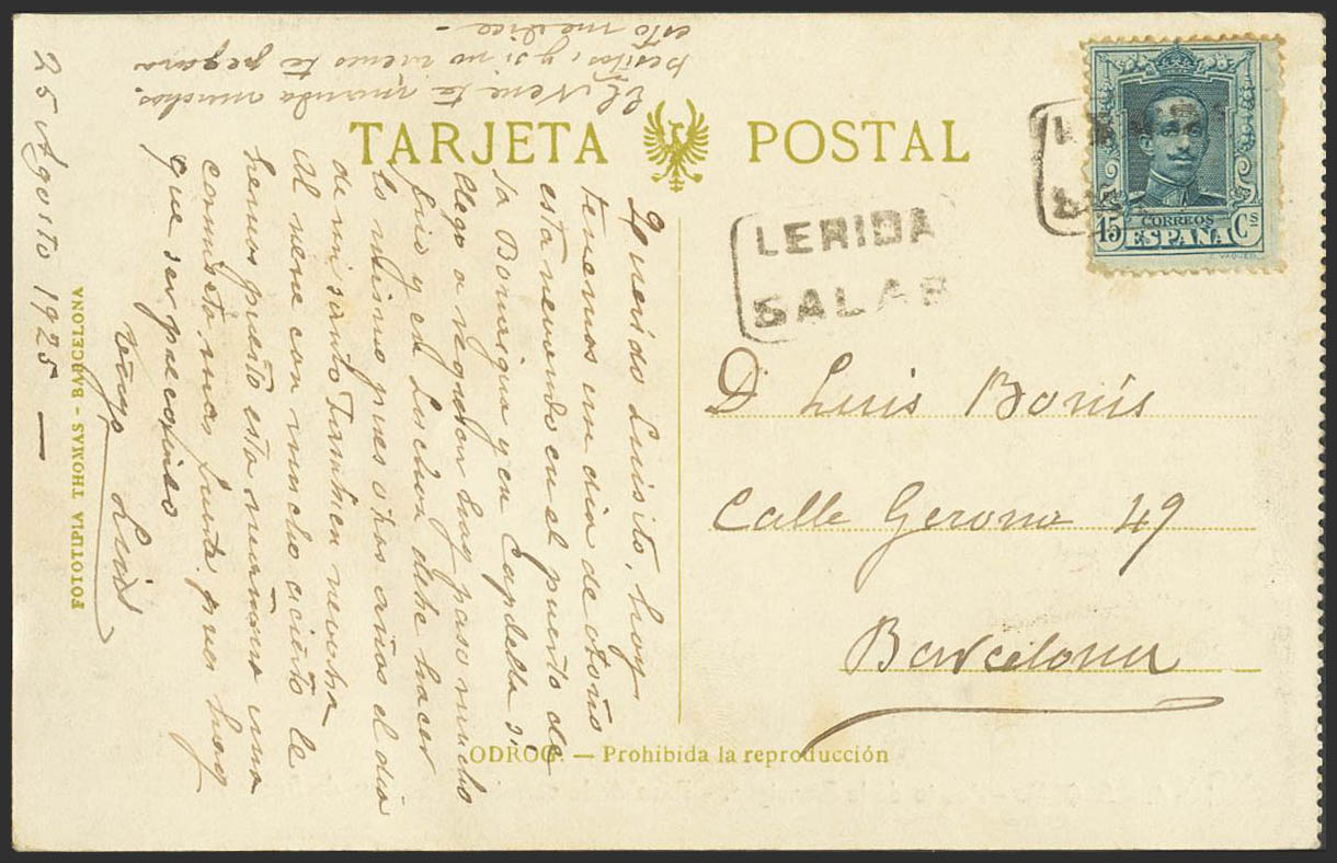 315. 1925. 15 cts greenish blue. Postcard from SALAS to BARCELONA. LERIDA / SALAS letter postmark. MAGNIFICENT AND RARE.