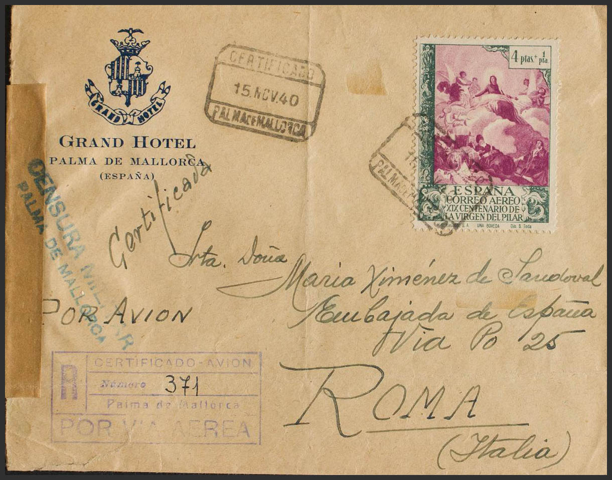 912. 1940. 4 sts + 1 sts green and lilac. Certificate from PALMA DE MALLORCA to ROME (ITALY). On the back arrival. MAGNIFICENT AND VERY RARE.