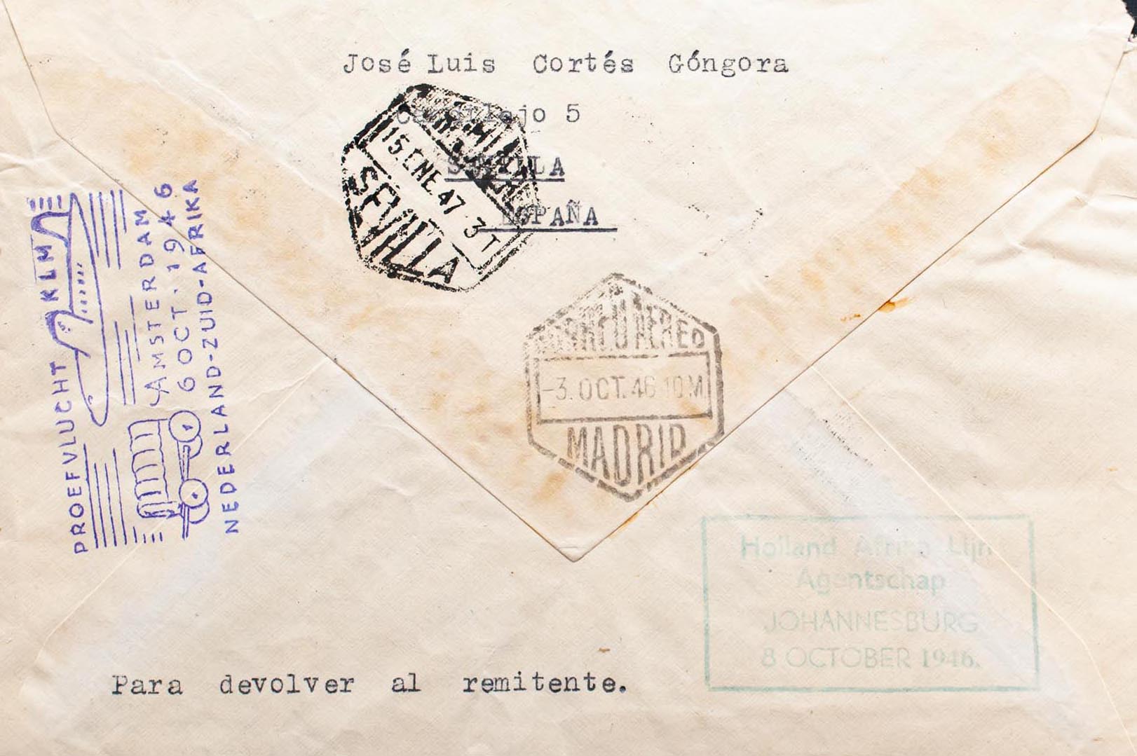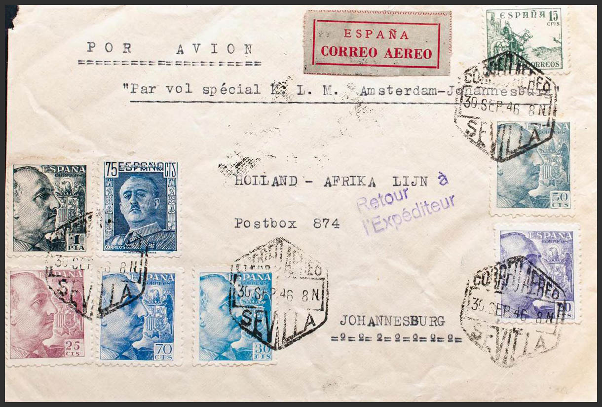 922/24, 927, 929, 930, 999. 1946. Various values. Air Mail from SEVILLE to JOHANNESBURG (SOUTH AFRICA). On the front text "Par Vol special KLM AMSTERDAM-JOHANNESBURG", on the back it marks PROEFVLUCHT KLM / AMSTERDAM / 6-OCT-1946 / NEDERLAND-ZUID AFRIKA. MAGNIFICENT AND RARE.