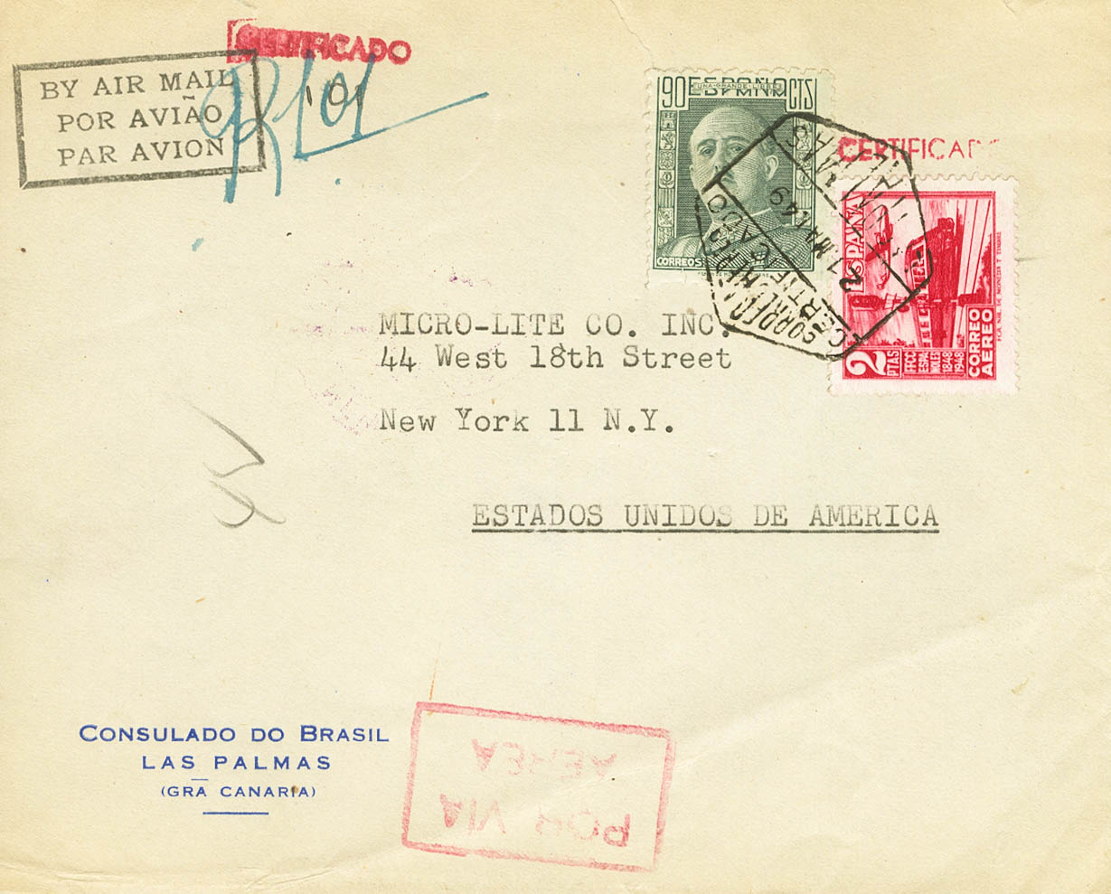 |ENVELOPE| 1039, 1000. 1949. 2 pts red and 90 cts green. Certificate from LAS PALMAS DE GRAN CANARIA to NEW YORK (USA). Arrival on the back. MAGNIFICENT.