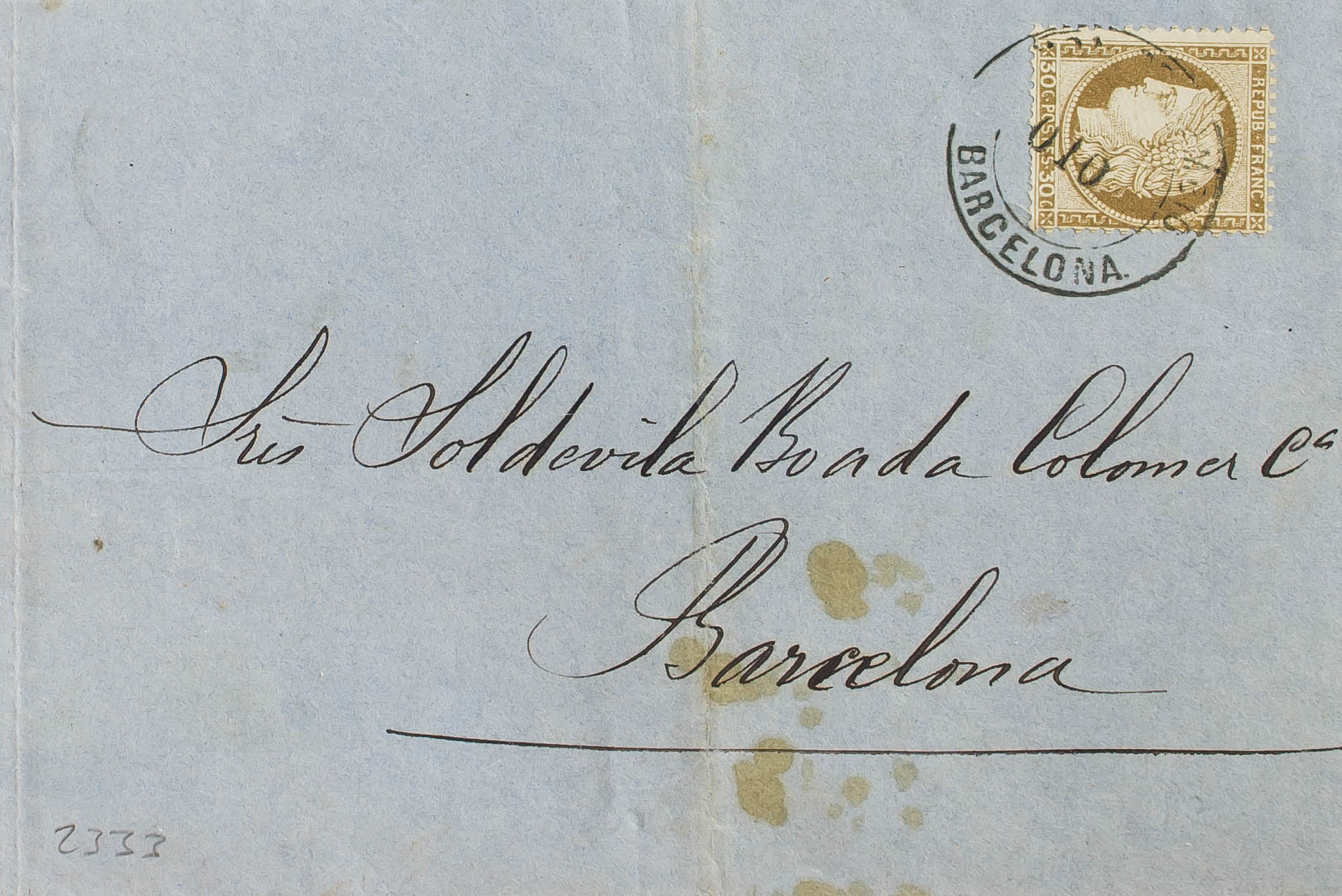 Yvert 56. 1876. 30 cts castaño. MARSELLA a BARCELONA. Matasello ADMON. DE CAMBIO / 0,10 / BARCELONA, aplicado a la llegada. MAGNIFICA Y RARO MATASELLO SOBRE EL VALOR DE 30 CTS.
