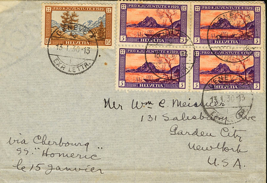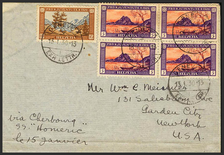 Yvert 235(4), 236. 1930. 5 cts, bloque de cuatro y 10 cts. GINEBRA a NUEVA YORK (U.S.A.). MAGNIFICA.
