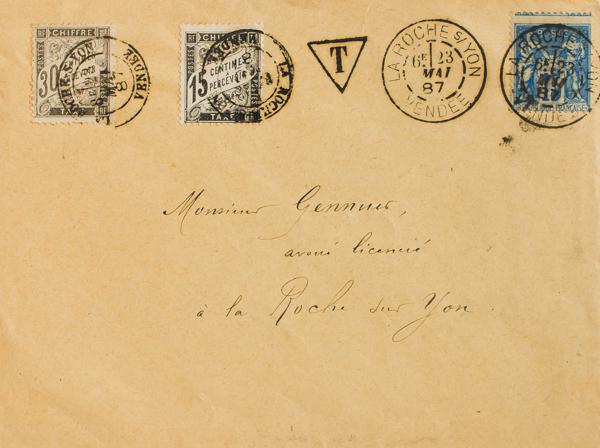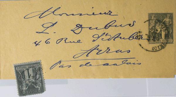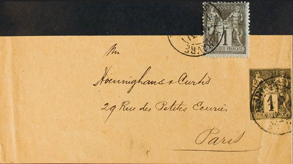 Yvert 83b. 1898. 1 cts negro sobre gris (defecto de origen). Impreso (completo) de BAIS a YURE L´EVEQUE, y reexpedida a LEMANS. Matasello BAIS / MAYENNE. MAGNIFICO.
