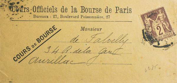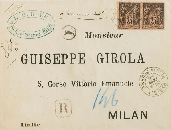 Yvert 97(2). 1894. 25 cts negro sobre rosa, pareja (Tarifa: carta 25 cts + certificado 25 cts). Certificado de PARIS a MILAN (ITALIA). Matasello PARIS.1 / PL.DE LA BOURSE. MAGNIFICA.