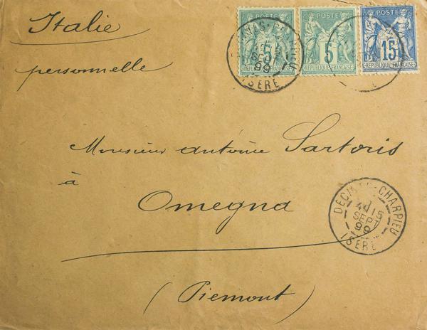 Yvert 75, 90. 1899. 5 cts verde, dos sellos y 15 cts azul. DECINES-CARPIEU a OMEGNA (ITALIA). Matasello DECINES-CARPIEU / ISERE, al dorso llegada. MAGNIFICA.