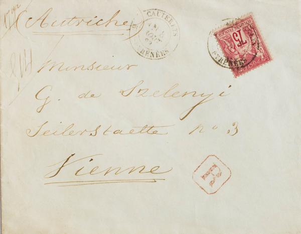 Yvert 99. 1891. 75 cts violeta sobre amarillo. Certificado de PARIS a BUDAPEST (HUNGRIA). Matasello PARIS-54 / R. DES BATIGNOLES, al dorso llegada. MAGNIFICO Y RARO.