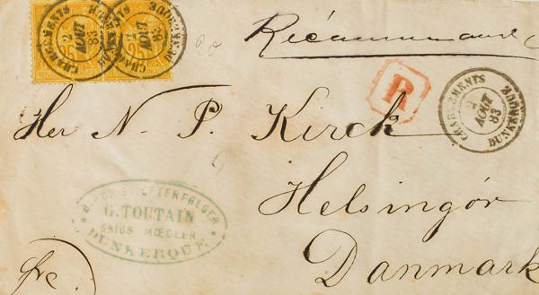 Yvert 82(2), 98. 1892. 1 fr oliva, dos sellos y 50 cts rosa. Certificado de MARGERIE HANCOURT a RHEINFELDEN (ALEMANIA). Matasello "Pointillé" MARGERIE-HANCOURT / (49), al dorso llegada. MAGNIFICO Y ESPECTACULAR, EXTRAORDINARIAMENTE RARO FRANQUEO.