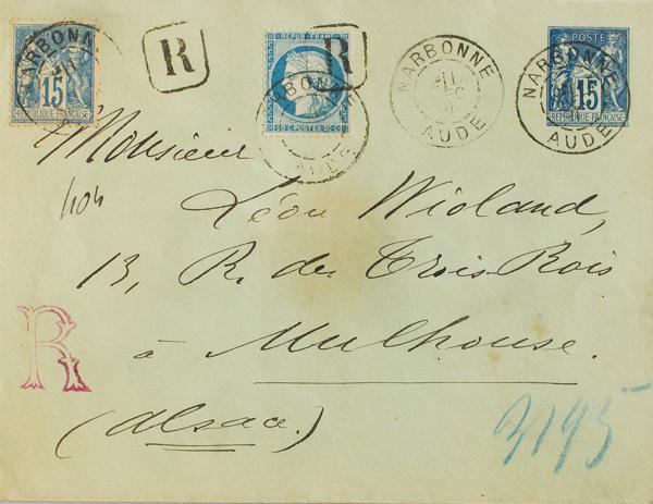Yvert 90, 37. 1891. 15 cts azul sobre Entero Postal Certificado de NARBONA a MULHOUSE (ALSACIA), con franqueo complementario de 20 cts azul (Siege) y 15 cts azul (Tarifa: carta 25 cts + certificado 25 cts). Matasello NARBONNE / AUDE, al dorso ambulante BORDEAUX A PARIS RAPIDE. MAGNIFICA Y MUY RARO FRANQUEO CON EL 20 CTS SIEGE.