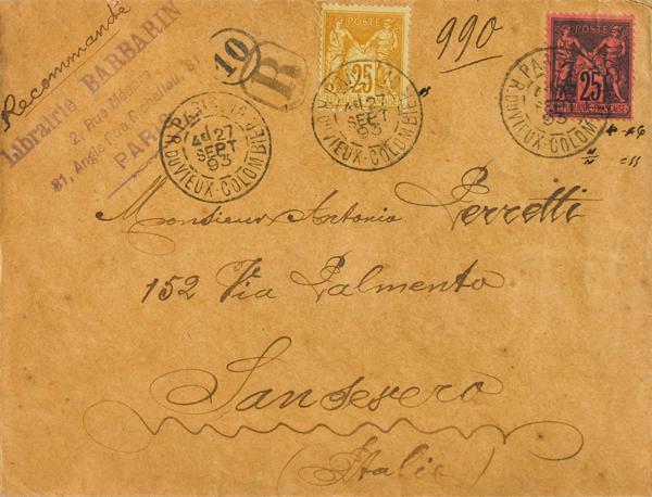 Yvert 91, 92. 1893. 25 cts negro sobre rojo y 25 cts bistre sobre amarillo (Tarifa: carta 25 cts + certificado 25 cts). Certificado de PARIS a SANSEVERO (ITALIA). Matasello PARIS 10 / R. DU VIEUX COLOMBIER. MAGNIFICA.