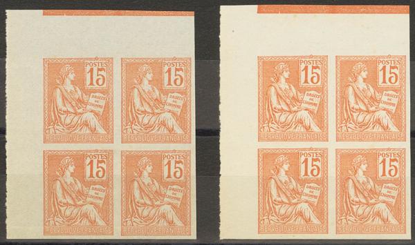(★)Yvert 117c(8). 1900. 15 cts naranja, dos bloques de cuatro. SIN DENTAR. MAGNIFICOS. Yvert 2014: 2.200 Euros