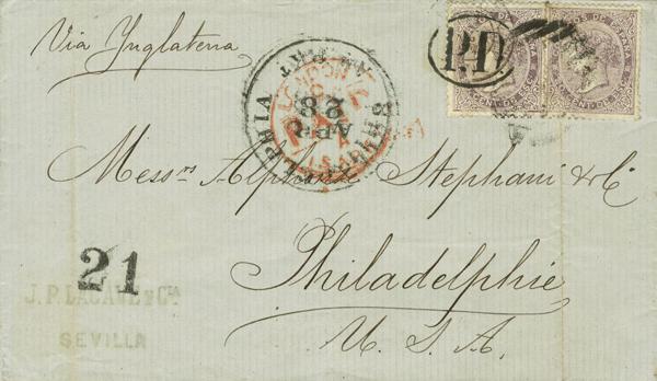 108, 109. 1870. 100 mils castaño rojo y 200 mils castaño. CADIZ a BUENOS AIRES (ARGENTINA). El franqueo correcto para Argentina por vÃa de Lisboa es de 350 mils según tarifa de Agosto de 1867. MAGNIFICA Y RARO FRANQUEO INSUFICIENTE Y NO TASADO.