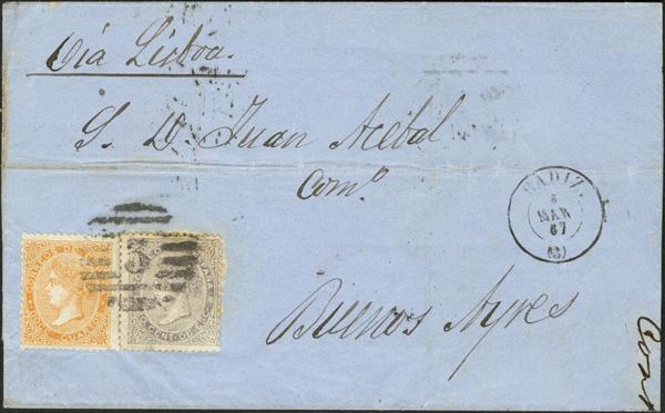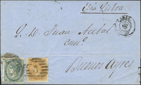 109, 113. 1870. 200 mils castaño y 12 cuartos castaño claro. CADIZ a BUENOS AIRES (ARGENTINA). Franqueo de 200 mils + 12 cuartos (150 mils) = 350 mils, según tarifa en vigor desde Agosto de 1867 por la vÃa de Portugal, que era la más económica para paises de Ultramar. MAGNIFICA E INUSUAL.