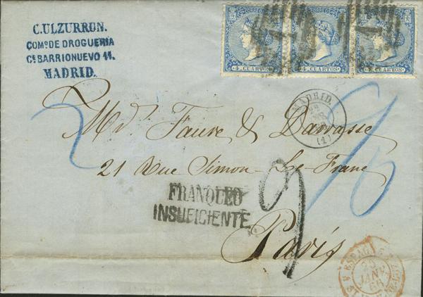 107(3), 113. 1870. 50 mils azul, bloque de tres sellos y 12 cuartos castaño. Dirigida a BIARRITZ (FRANCIA). MAGNIFICA Y EXTRAORDINARIAMENTE RARA COMBINACION PARA CONSEGUIR LA TARIFA DE DOBLE PORTE.