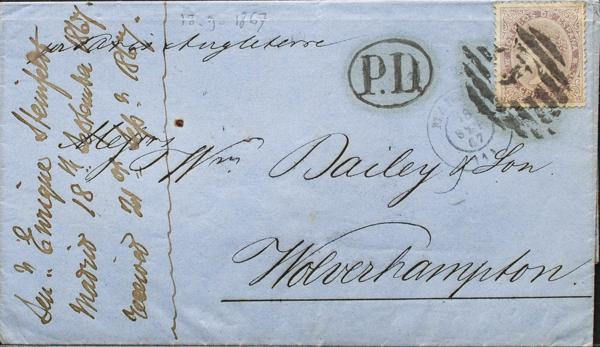 106, 113. 1870. 25 mils lila gris y 12 cuartos castaño. MADRID a LYON (FRANCIA). MAGNIFICA Y RARISIMA TARIFA DE ALCANCE, COMBINACION MUY RARA A FRANCIA.