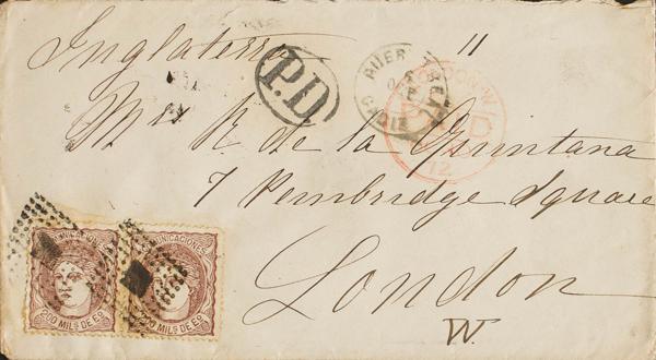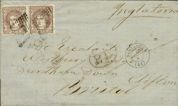 109(2). 1872. 200 mils., pareja. SANTANDER a BRISTOL (INGLATERRA). Matasello ROMBO DE PUNTOS, en el frente SANTANDER / (43), doble porte. MAGNIFICA.