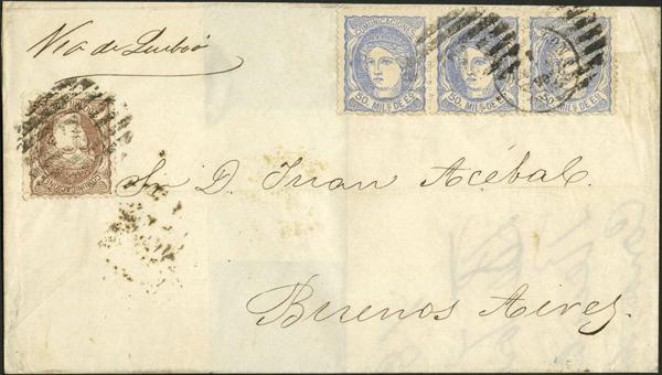 107(3), 109. 1870. 50 mils., tira de tres y 200 mils. BARCELONA a BUENOS AIRES (ARGENTINA). Matasello PARRILLA Nº 2. MAGNIFICA E INUSUAL.