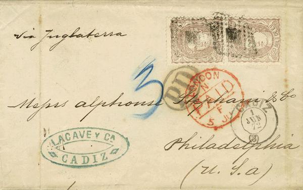 124, 125. 1873. 25 cts y 40 cts. BARCELONA a MONTEVIDEO (URUGUAY), sellos sin inutilizar, al ser depositada la carta directamente en el buzón del barco. Al llegar a Uruguay se tasa internamente con la marca 10 CENTMOS. MAGNIFICA Y MUY RARO DESTINO.