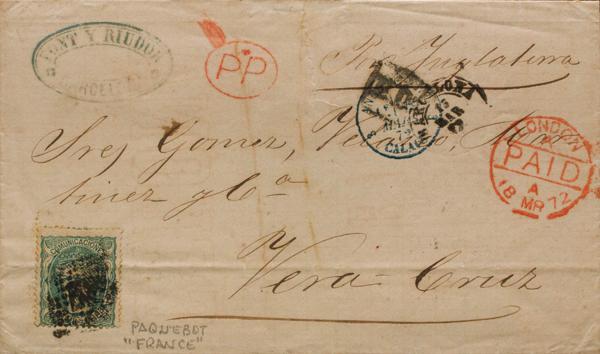 118, 121, 126. 1873. 5 cts rosa, 10 cts ultramar y 50 cts verde. BARCELONA a BUENOS AIRES (ARGENTINA). En el frente manuscrito "VÃa Barcelona Por Picardie" y porte 2/4 manuscrito. MAGNIFICA Y RARO FRANQUEO DE 65 CTS O 250 MILS POR LA VIA BARCELONA SEGUN TARIFA EN VIGOR DESDE AGOSTO DE 1870.