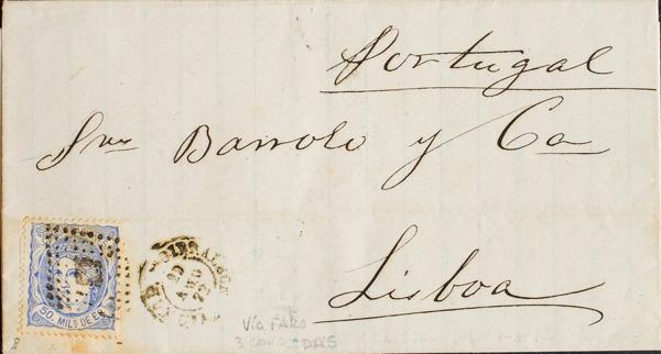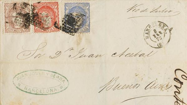 133, 135, 137. 1873. 10 cts verde, 25 cts castaño y 50 cts ultramar. BARCELONA a BUENOS AIRES (ARGENTINA). Franqueo de 85 cts (350 mils de escudo), para las cartas circuladas vÃa Portugal según la tarifa de Agosto de 1867 (doblez de archivo). BONITA Y RARA.