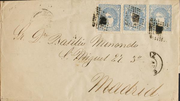 121(4), 126. 1872. 10 cts azul, tira de tres y un sello y 50 cts verde. Certificado dirigido a PARIS (FRANCIA). En el frente marca CHARGE, aplicada en Francia y al dorso lacradores y toma de razón, tarifa de 40 cts para el porte y 50 cts de derechos de certificado. MAGNIFICA PIEZA DE GRAN ESPECTACULARIDAD Y RAREZA, EL CORREO CERTIFICADO DE AMADEO I DEBE SER CONSIDERADO MUY RARO.