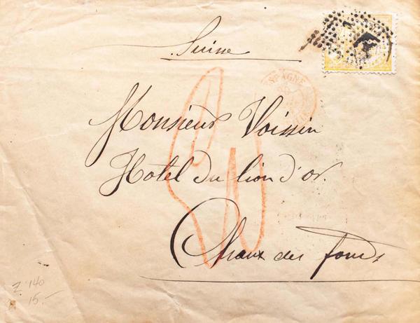 136. 1873. 40 cts castaño. MADRID a PARIS. MAGNIFICA E INUSUAL MARCA PRECURSORA DE LO QUE LUEGO FUERON LOS MEMBRETES COMERCIALES.